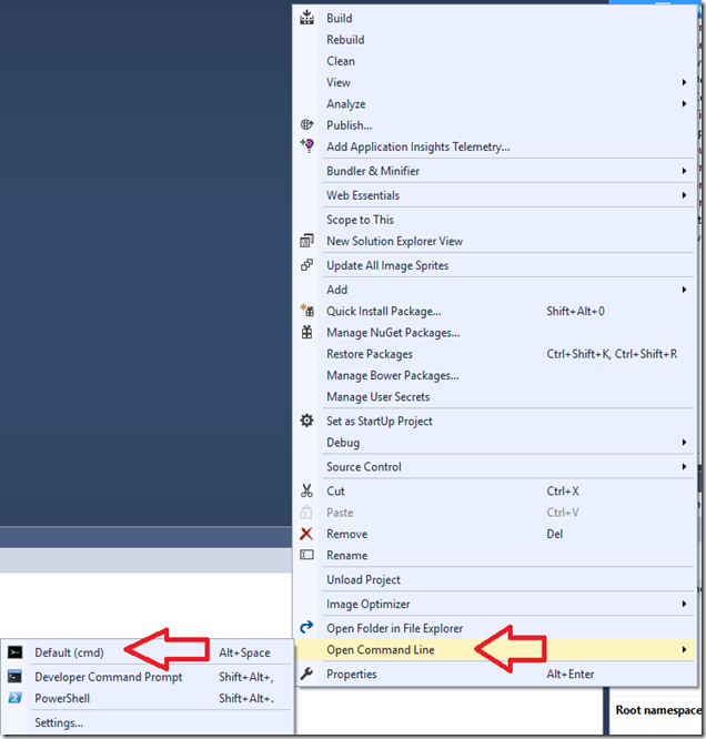 In solution explorer, right-click on the SQLiteWeb node the choose “Open Command Line” >> “Default (cmd)”