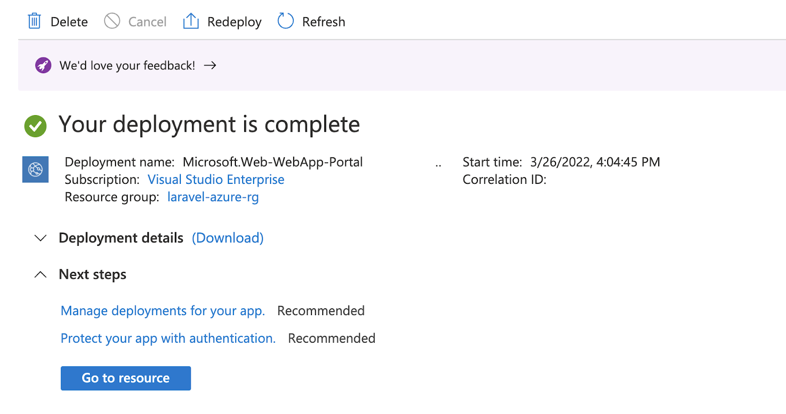 Once your app service is successfully provisioned, you can click on the "Go to resource" button.